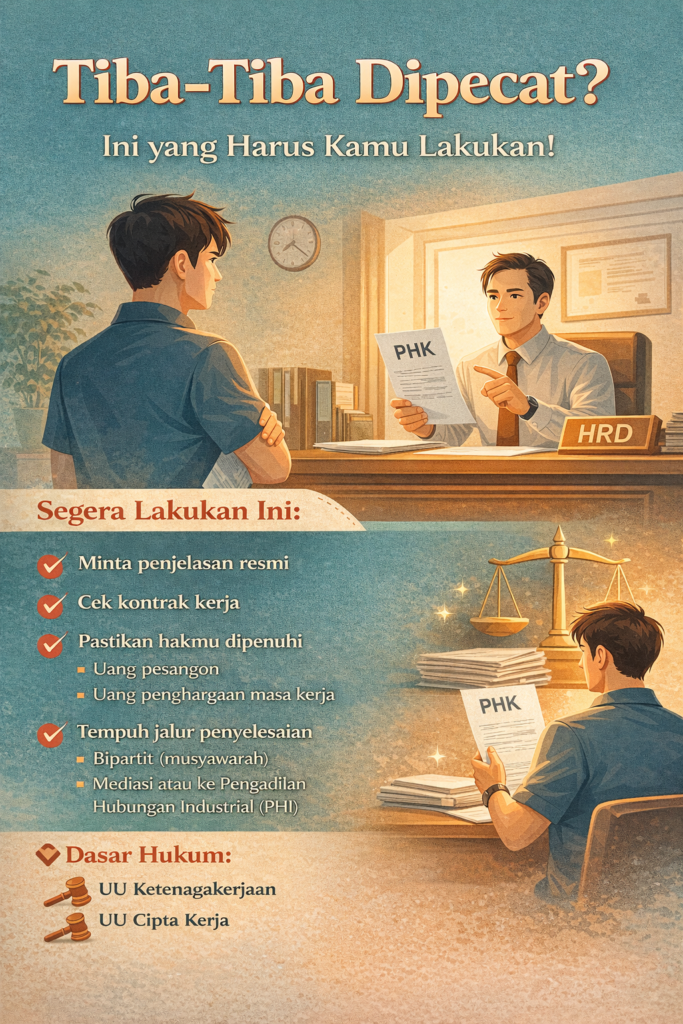 Pemutusan hubungan kerja (PHK) secara tiba-tiba tentu menjadi situasi yang mengejutkan dan tidak menyenangkan. Banyak pekerja yang merasa bingung, panik, bahkan langsung pasrah ketika diberhentikan tanpa penjelasan yang jelas. Padahal, dalam hukum ketenagakerjaan di Indonesia, tindakan tersebut tidak bisa dilakukan secara sembarangan oleh perusahaan.